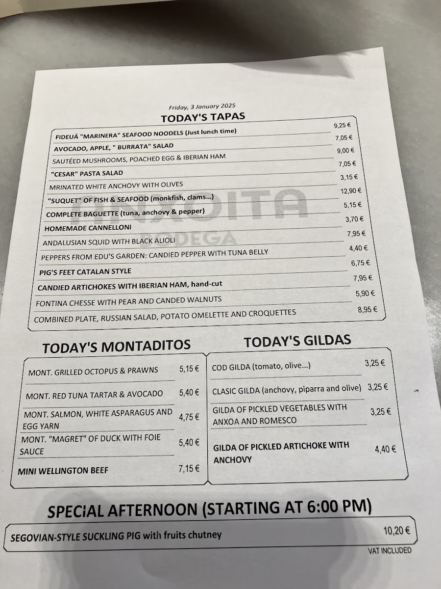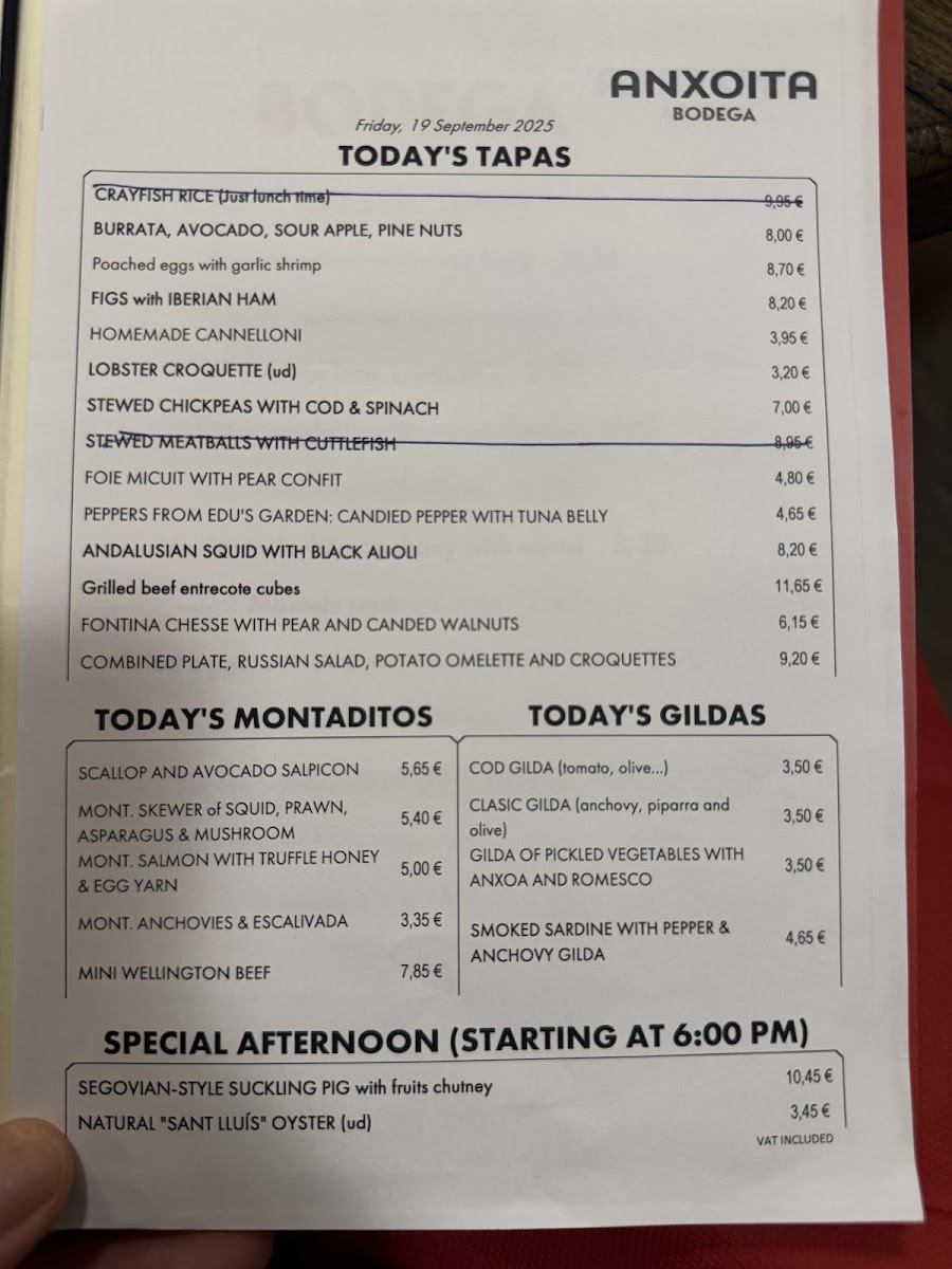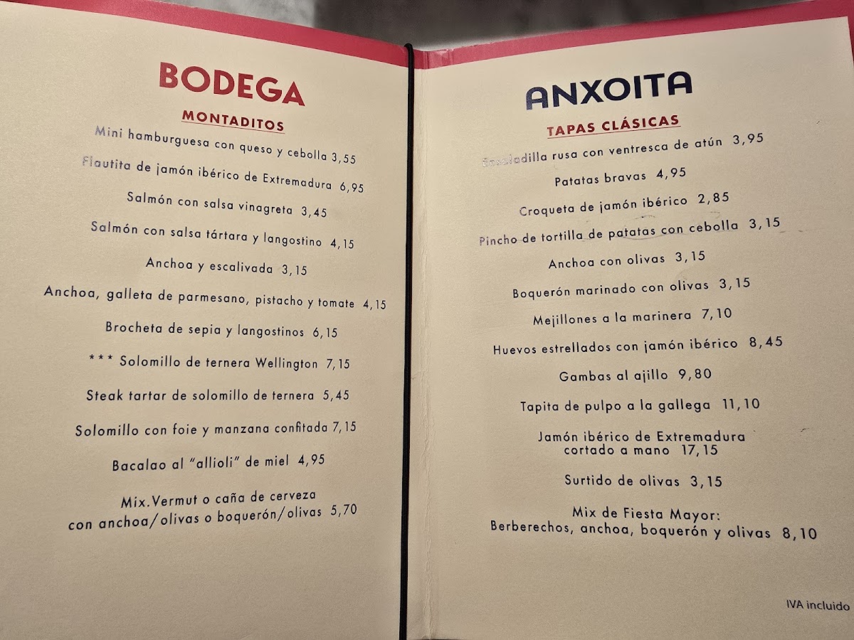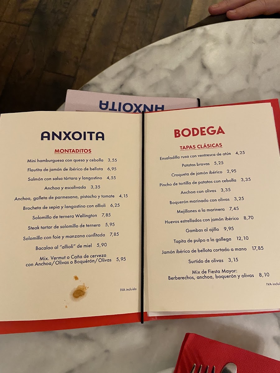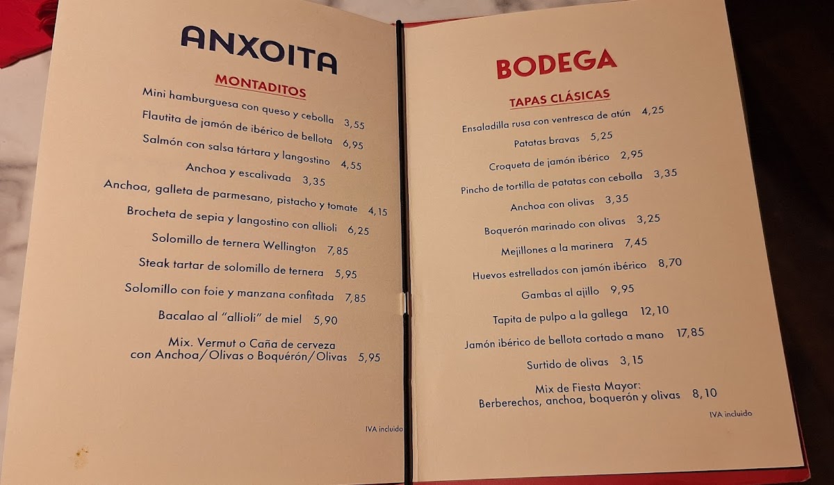 Anxoita Bodega Menu